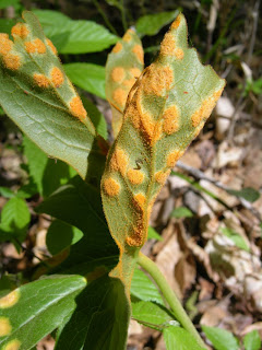 As for the rest of the mycota, I didn't see a whole lot out there. Pretty much no mushrooms, but I did see a lot of mayapple rust. Mayapple is quite a common wildflower in the eastern US, and was flowering in great abundance yesterday. The distribution of the rust was very patchy, affecting single individuals here and there.